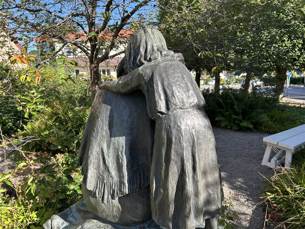 Skulpturen har en intressant historia och inte minst ett unikt och ömsint uttryck. Det är en komplicerad form med en grupp bestående av tre människor. Det handlar om samspelet dem emellan, om sorg men också om kärlek. Lägg märke till Carl Eldhs förmåga att skildra tygets veckning, och inte minst hur han skildrat händer och fötter. Mamman håller sin hand med långsmala fingrar runt det lindade barnet, medan den andra tar stöd med knogen i marken. Också den lilla flickans nakna fötter är förunderligt ömsint och skickligt gjorda.
