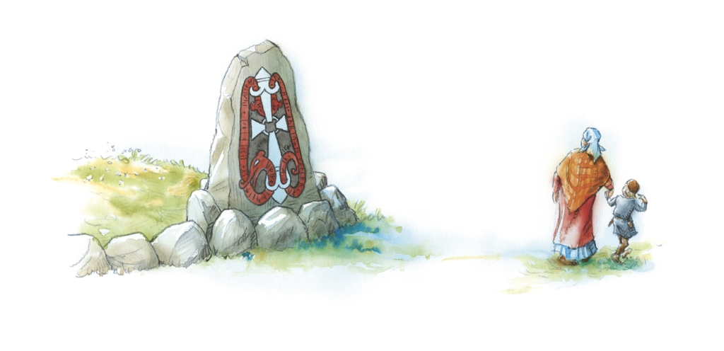 Någon har ställt upp en stor sten intill vägen. På den finns en text skriven med järnålderns bokstäver. De kallades runor och ristades eller höggs in i stenen så att vi kan läsa dem än idag.