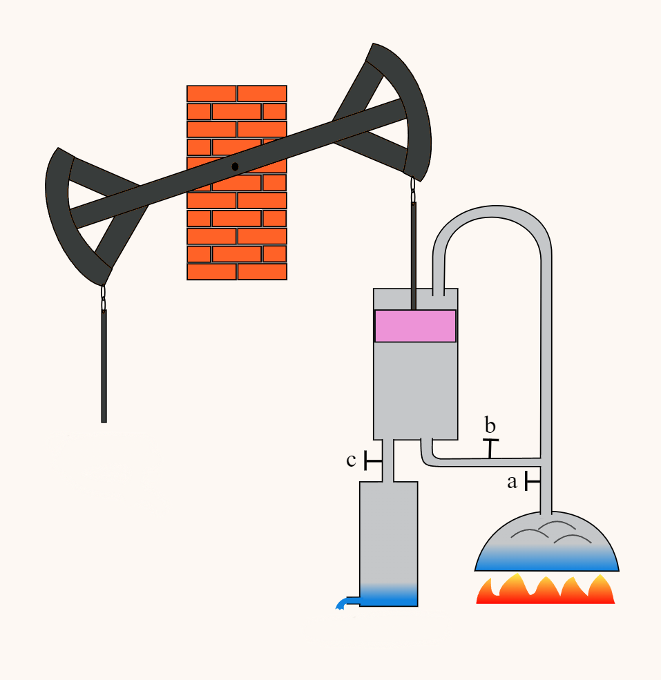 Ångmaskinen startar när elden längst ner till höger värmer upp vattnet som blir vattenånga och stiger i rören. Ventilerna a-c öppnas och stängs så att ångan pressar den rosa kolven upp och ner. Den pumpande rörelsen användes sedan till att driva olika fordon eller maskiner.