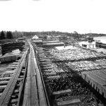 Ett svartvitt foto av några hus vid vattnet omgivna av högar av trä och virke.