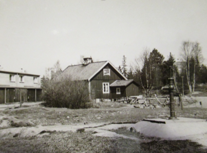 Elsa är det minsta barnet på bilden. Hon står tillsammans med mamma Sigrid (längst till vänster) och pappa August (längst till höger) framför torpet Älgestavret. Två inneboende är också med på bilden.
