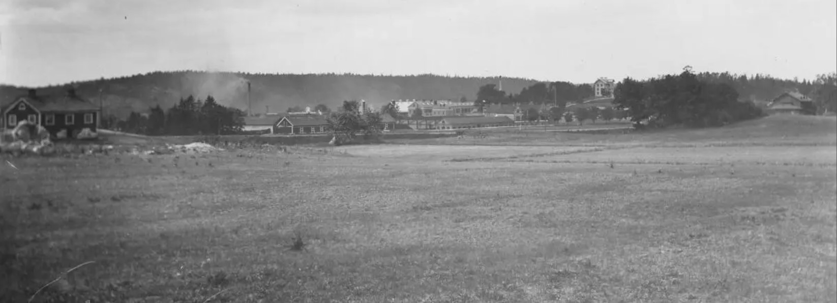 Här ser du ängen från andra hållet. Fotografen har stått nedanför Järla skola och fotograferat Järla gård och fabrikerna år 1898.