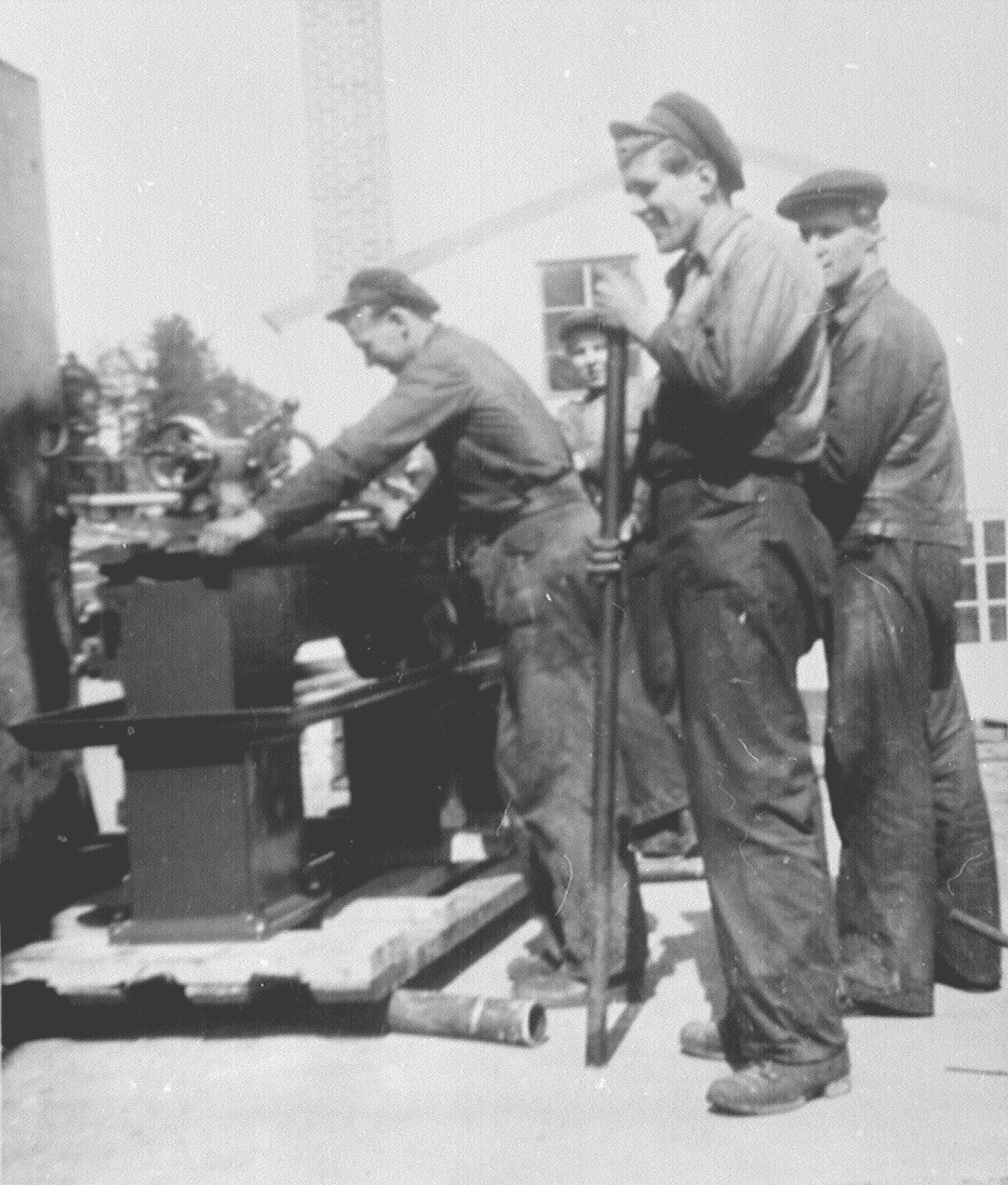 När efterfrågan på bilar sjönk under kriget började Sörlings tillverka svarvar istället. Här står fyra arbetare och en svarv på Sörlings gård.