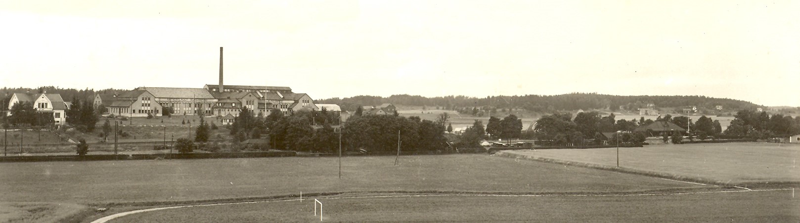 Närmast järnvägen mitt ligger Märsta såg och längre bort färgfabrikens olika byggnader. Foto från 1949.