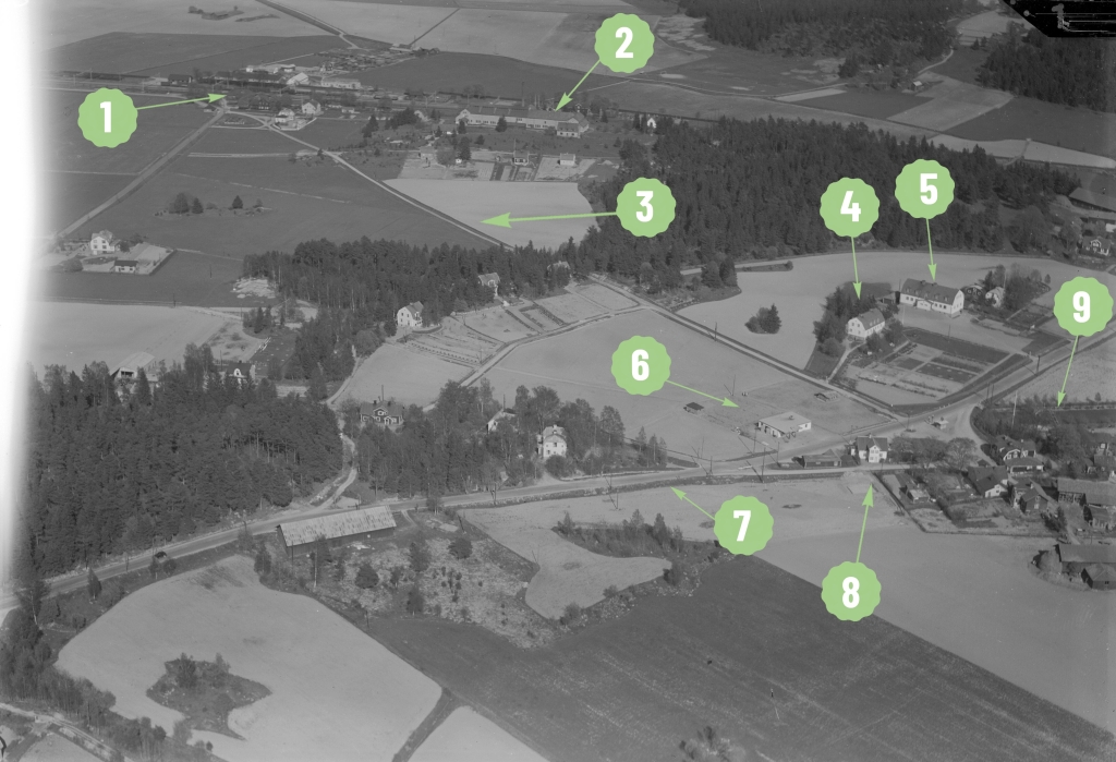 3. Vägen som idag är gång- och cykelväg gick från stationen till det som då var centrum. På åkern till höger ligger idag Sätunaparken.