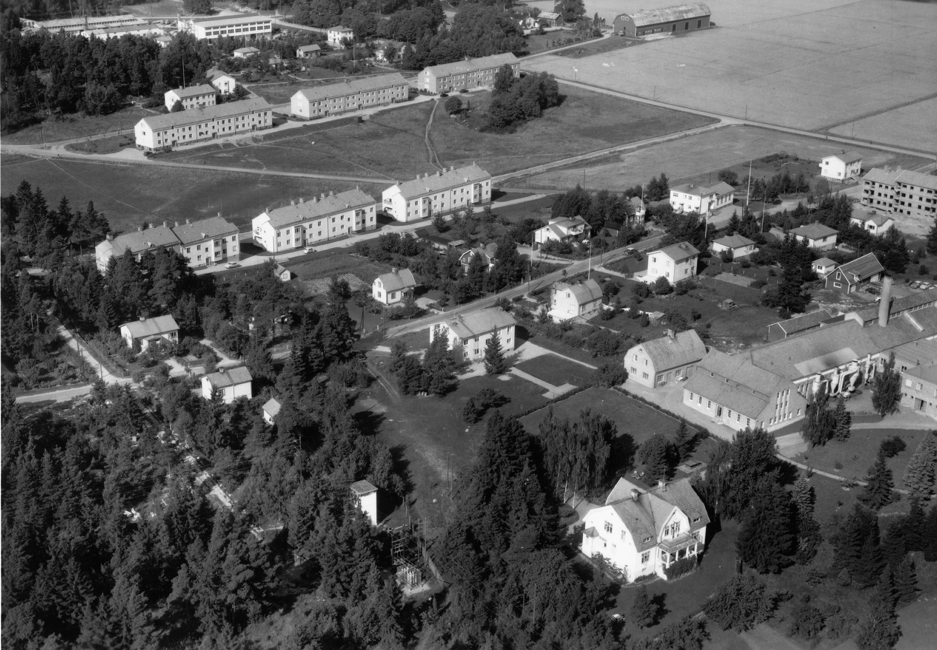 Märsta på 1930-talet. Mellan kexfabriken till höger i bild och Sörlings verkstad i fotots överkant har både villor och några hyreshus byggts.