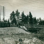 Mitt emot Stuvsta Station låg Stuvstabolagets kontor i en liten timrad stuga med grästak. Vägen fortsätter över spåren. Från den går en trappa ner till perrongen.