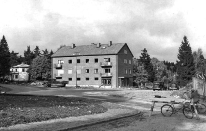 År 1949 var huset klart. Läkare Axelsson flyttade in och öppnade sin mottagning. På bottenvåningen blev det Konsum. Det var Stockholms första snabbköp utanför innerstaden. I ett snabbköp gick du själv och plockade de varor du ville ha och betalade i kassan. Om du istället hade handlat mat före snabbköpens tid så hade du gått fram till expediten som stod bakom en disk. Sedan fick räkna upp alla varor du ville ha. Expediten mätte, vägde och tog betalt. Det gick nog oftast inte så snabbt.