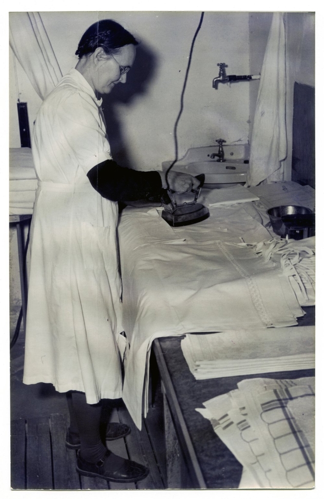Svartvitt fotografi, två kvinnor stryker och hänger tvätt i tvätteriet.