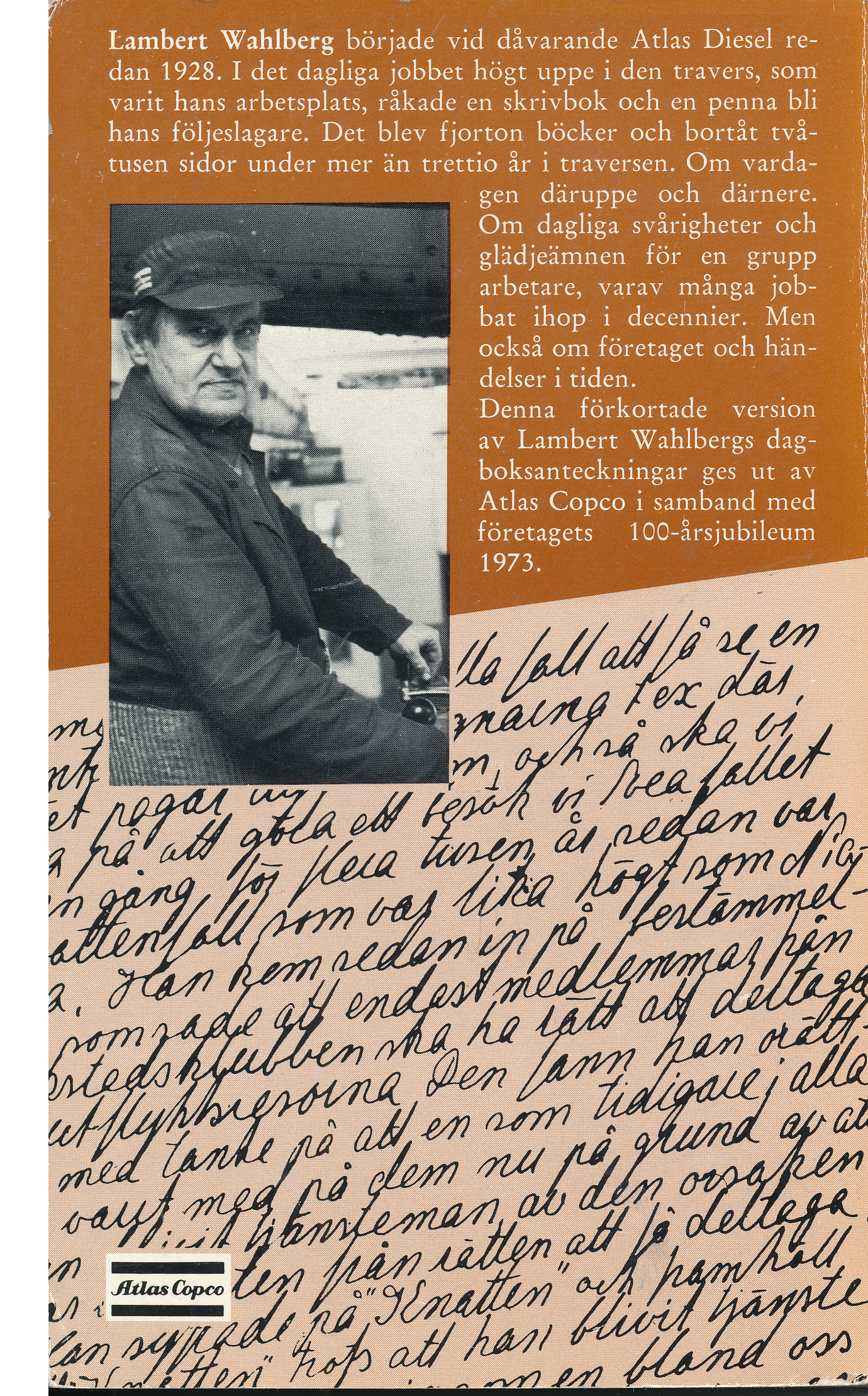 Foto av Lambert Wahlberg på baksidan av den bok som Atlas Copco gav ut med stora delar av Wahlbergs dagböcker.