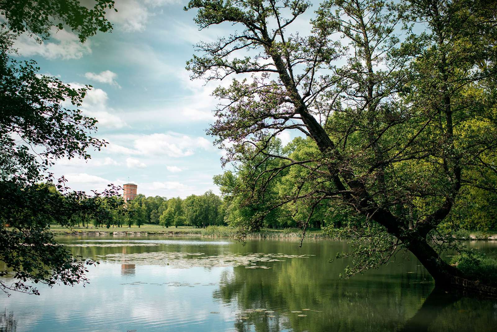 Vy över en av de konstgjorda kanalerna i Drottningholms slottspark med Götiska tornet i bakgrunden.